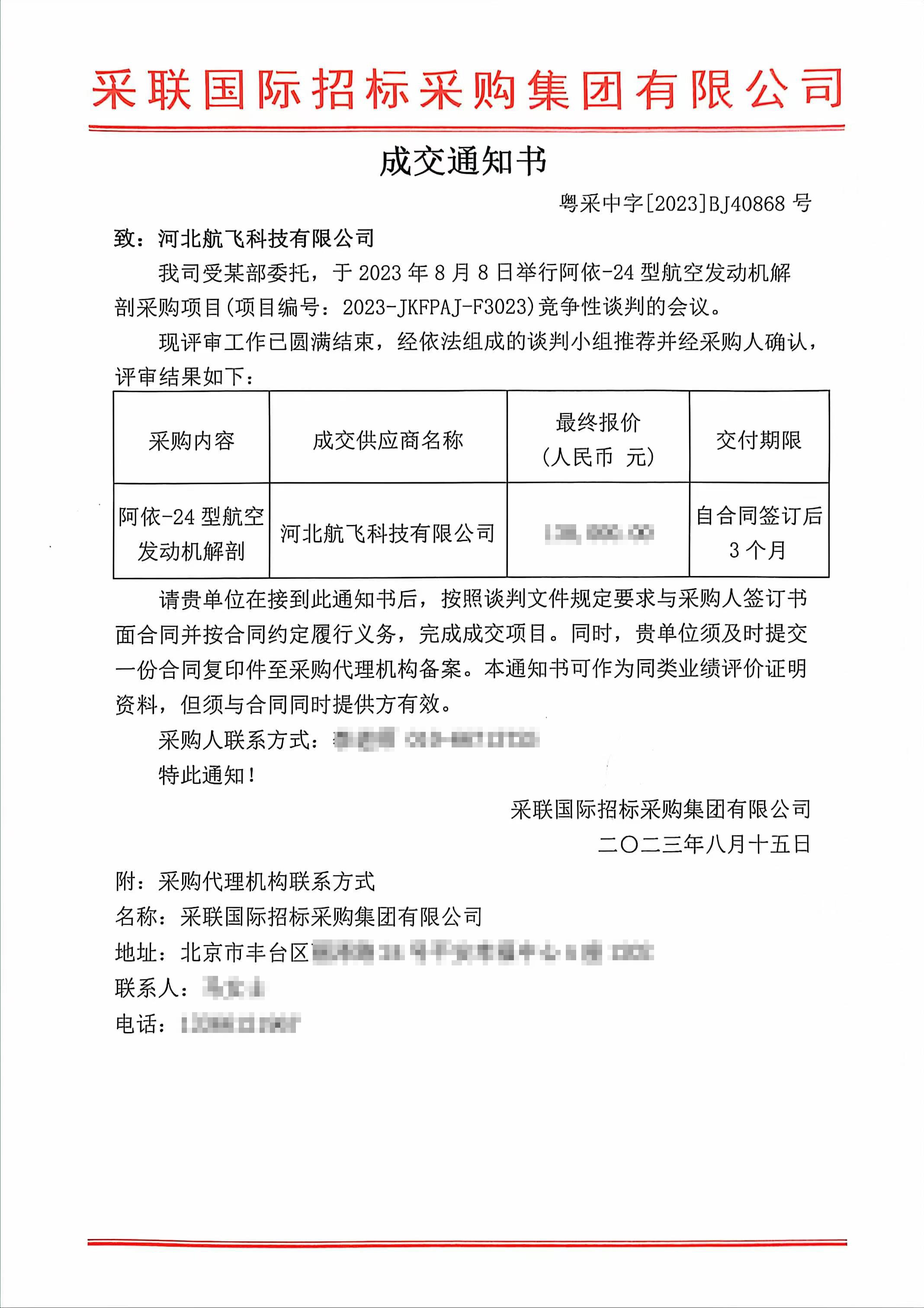 于2023年8月15日,我司獲悉項目中標通知書 ......